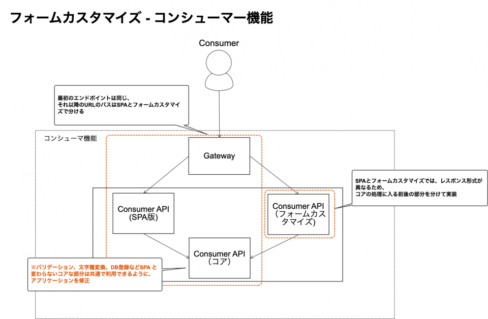つまり処理の最初と最後が違うだけで、リクエストを受け取った後の実処理であるバリデーション・文字種変換処理・データベース登録処理等は、SPA のフォームとフォームカスタマイズ機能両方で使える共通化可能な処理と考えて共通部品化しました。