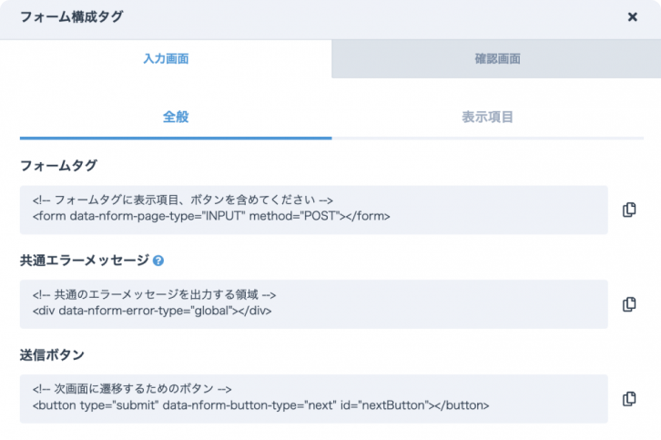 (以下は「フォーム構成タグ」を表示しているモーダルウインドウのキャプチャです)