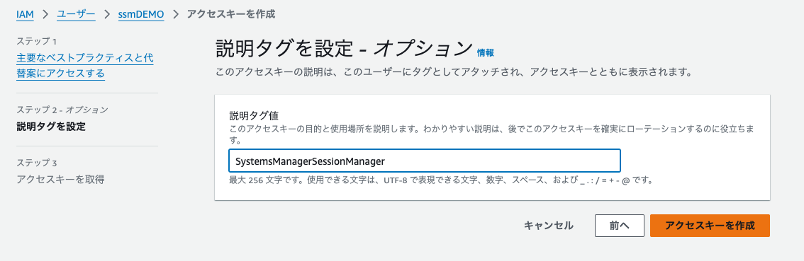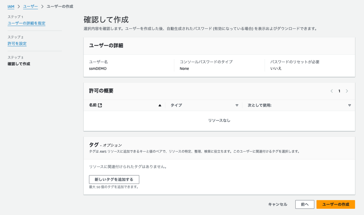 説明タグ値は適宜つけてあげる(ここではSystemsManagerSessionManagerとした)