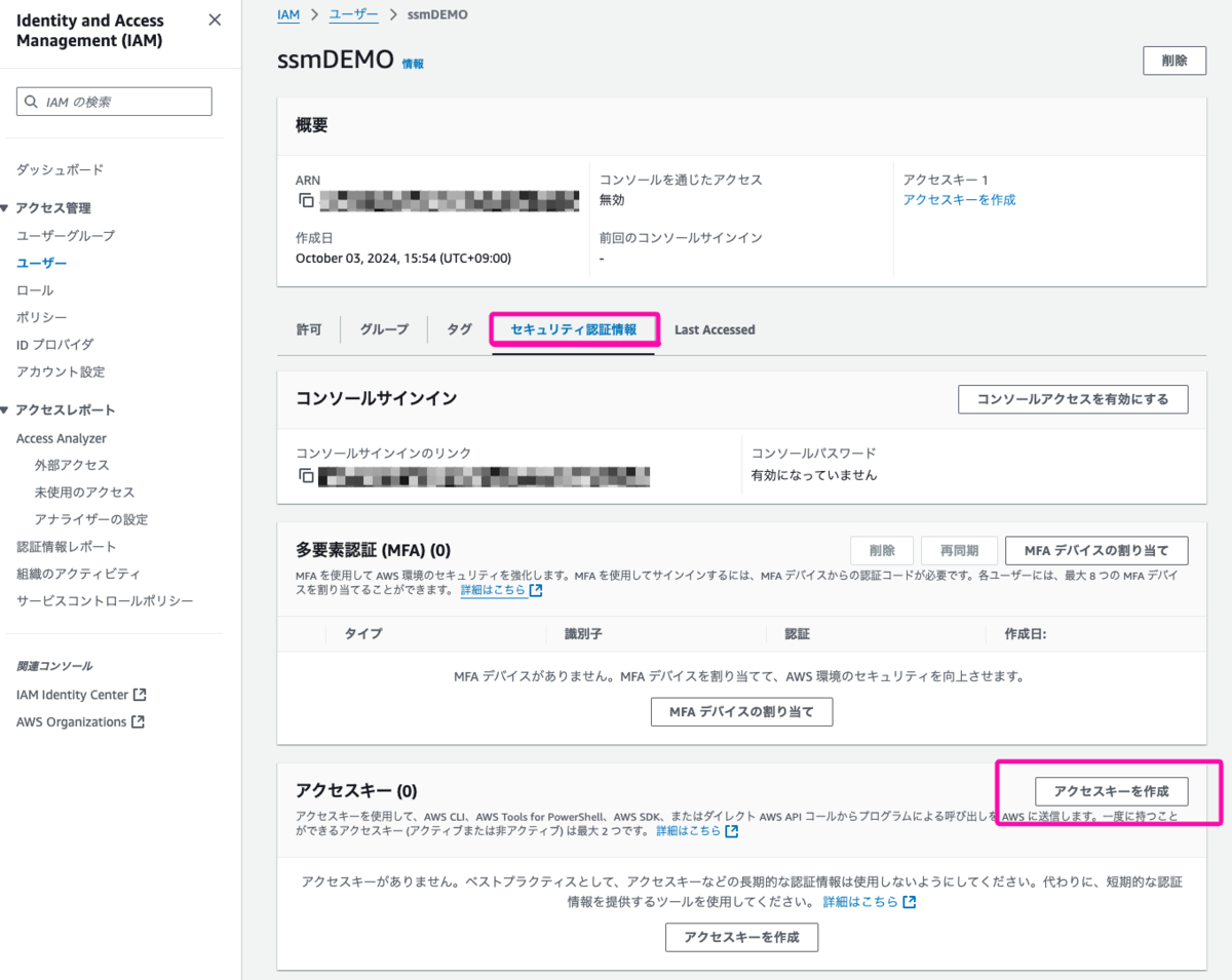 アクセスキーとシークレットアクセスキーを必ずメモする(ここで見逃すと二度と見られない)