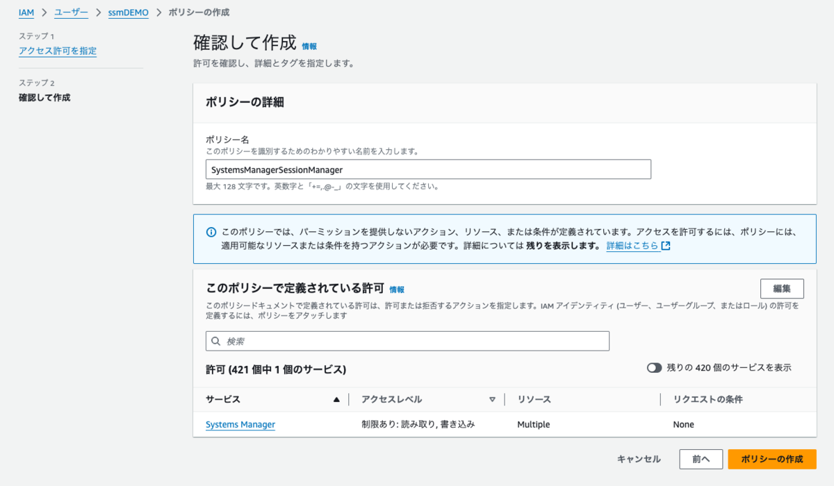 ポリシー名は適宜つけてあげる(ここではSystemsManagerSessionManagerとした)