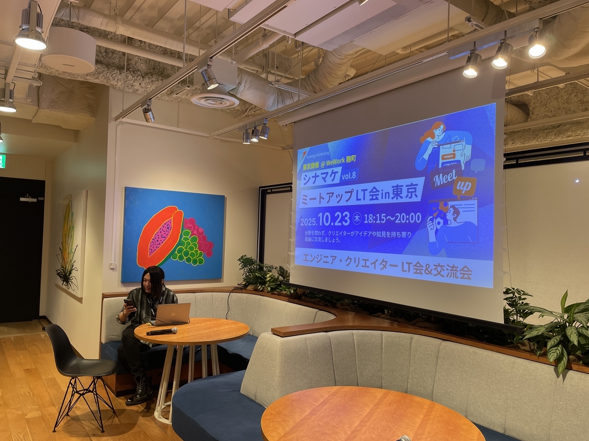 「シナマケミートアップ」は、IT やクリエイティブ分野に関心を持つ人が集まり、知識と経験を共有する交流イベントです。2025年10月23日、東京・麹町で シナマケミートアップ@東京 #8 が開催されました。 通常は大阪で行っていますが、今回が初めての東京開催です。 本イベントは統一された全体テーマを設けず、各 LT のタイトルに沿って内容が展開されました。若手エンジニアの熱い想いや、日々の業務で欠かせないターミナル環境へのこだわり、書籍執筆についてのノウハウなどが次々と語られ、刺激的な時間となりました。